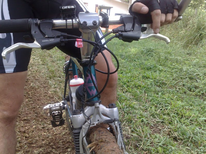 Caso não saibam, eu tenho uma bike da Gary Fisher de 1996 tamanho 17,5″. Bem velinha mesmo, comprei usada inclusive a + ou – 2 anos. Ela tem Kit Xt (8v) no cambio traseiro e dianteiro e nos V-brakes, e kit Lx no pé de vela e cubos. As rodas são Ayara 32 raios e os pneus Gtk. Canote, guidão, mesa e bar ends em alumínio da Transx. Be leve a bike, pela idade dela e deixa muita bike nova para trás nas trilhas e passeios que tenho feito. O futuro dessa bike vai ser virar bike de cicloturismo, mas enquanto não compro minha bike nova, vou me divertindo e muito com minha oldbike, apelido carinhoso para minha bike. Chamei ela de pretinha um pouco mais acima, pois ela era verde em sua cor original, mas estava muito arranhada a pintura, e a única coisa que valia a pena era deixar os adesivos e pintura original.